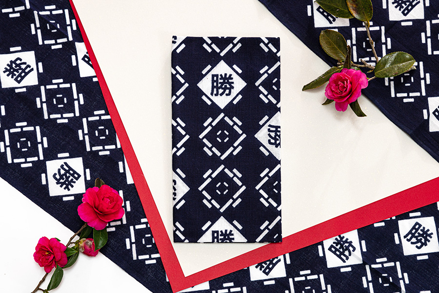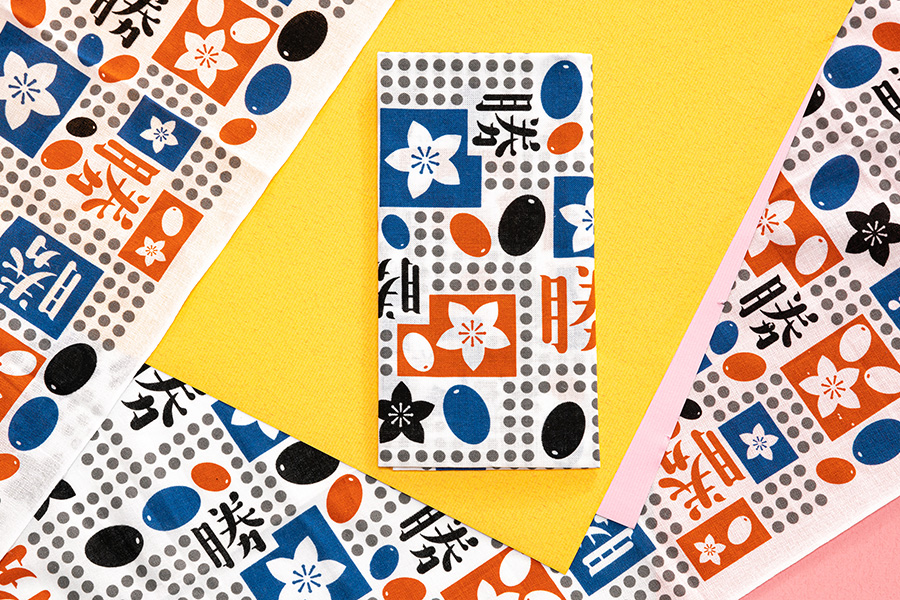 勝央町の縁起物をモチーフに縁起のいい意味と願いを込めた図柄を「勝紋」と名付け、"勝ち手"(=勝ちを願う人)の願いを祈り"勝紋"を染め込んだ手拭いが『勝手拭』です。